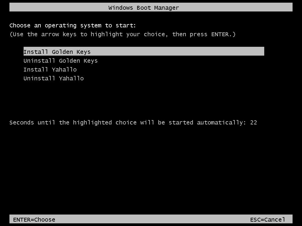 The boot default can be set to Install Golden Keys, Uninstall Golden Keys, Install Yahallo and Uninstall Yahallo. The default Boot Menu Timeout can also be modified to any duration the user requires, by default it is set to 30 seconds. Once the the countdown is complete the selected action will automatically run.